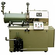 臥式砂磨機筒體內(nèi)的旋轉(zhuǎn)主軸上裝有多層圓盤。當(dāng)主軸轉(zhuǎn)動時,研磨介質(zhì)在旋轉(zhuǎn)圓盤 的帶動下研磨壓入筒內(nèi)的漿料,使其中的固體物料細化合格的漿料穿過小于研磨介質(zhì)粒度的過濾間隙或篩孔流出。筒體部分備有冷卻或加熱裝置,以防筒內(nèi)因物料、研磨介質(zhì)和圓盤等相互摩擦所產(chǎn)生的大量的熱影響產(chǎn)品質(zhì)量,或因送入的漿料冷凝以致流動性降低而影響研磨效能。研磨介質(zhì)可用適當(dāng)?shù)奶烊簧埃部捎昧6葹?.1~2毫米的人造玻璃珠,目前國內(nèi)外砂磨機均已使用氧化鋯珠充當(dāng)研磨介質(zhì),氧化鋯珠本身易清潔,硬度高,比玻璃珠及天然沙更耐磨,所以目前國內(nèi)高低檔砂磨機均使用氧化鋯珠作為研磨介質(zhì)。當(dāng)給料粒度小于450微米時,排料粒度可達1微米以下。這種磨機在細化物料的同時,還有分散和混合作用,適于磨制染料、顏料、油漆涂料、藥物和其他懸浮液或膠懸劑等。